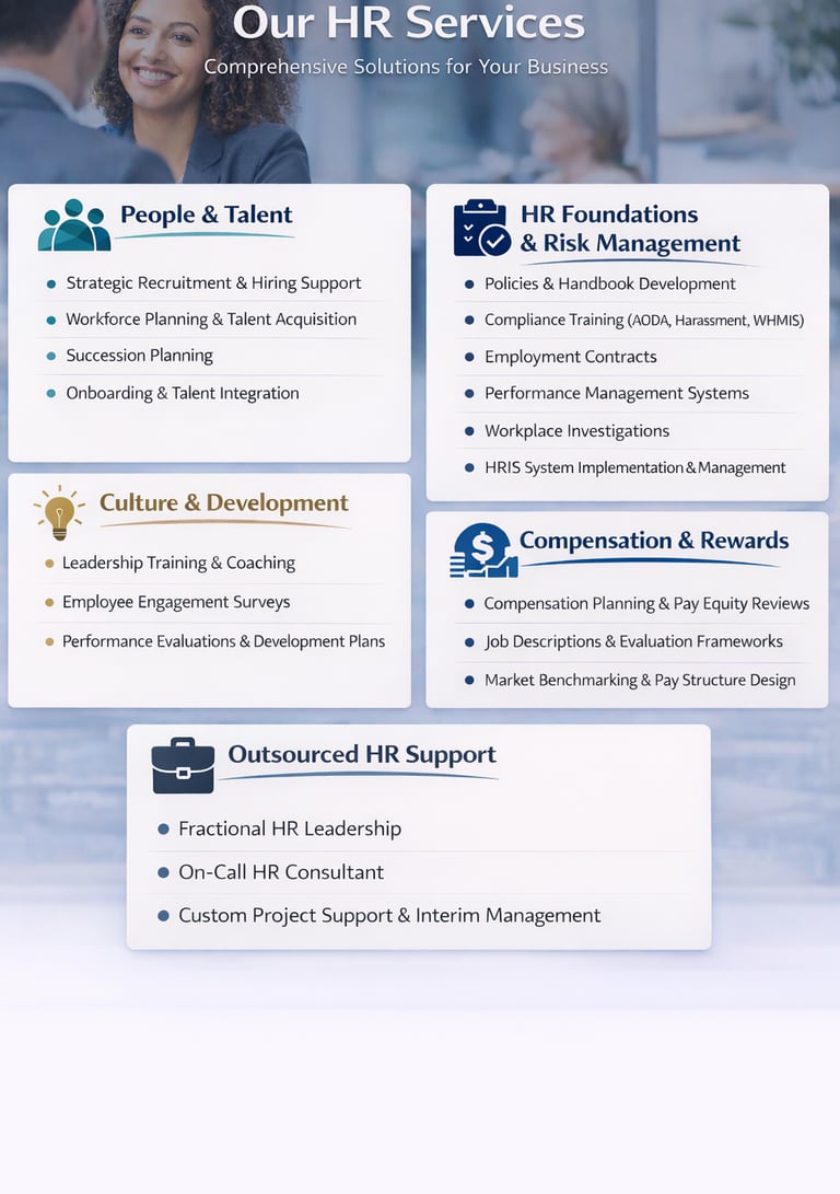 Ongoing, HR leadership without the full-time cost. We support onboarding, performance management, coaching, and day-to-day people operations while acting as a trusted extension of your leadership team.